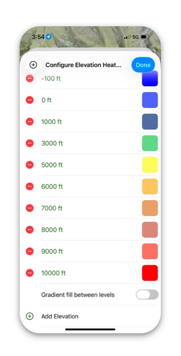 The Elevation Heat Map overlay allows you to visualize elevation ranges by color; easily capturing differences in elevation or highlighting the elevation ranges you are most interested in.
